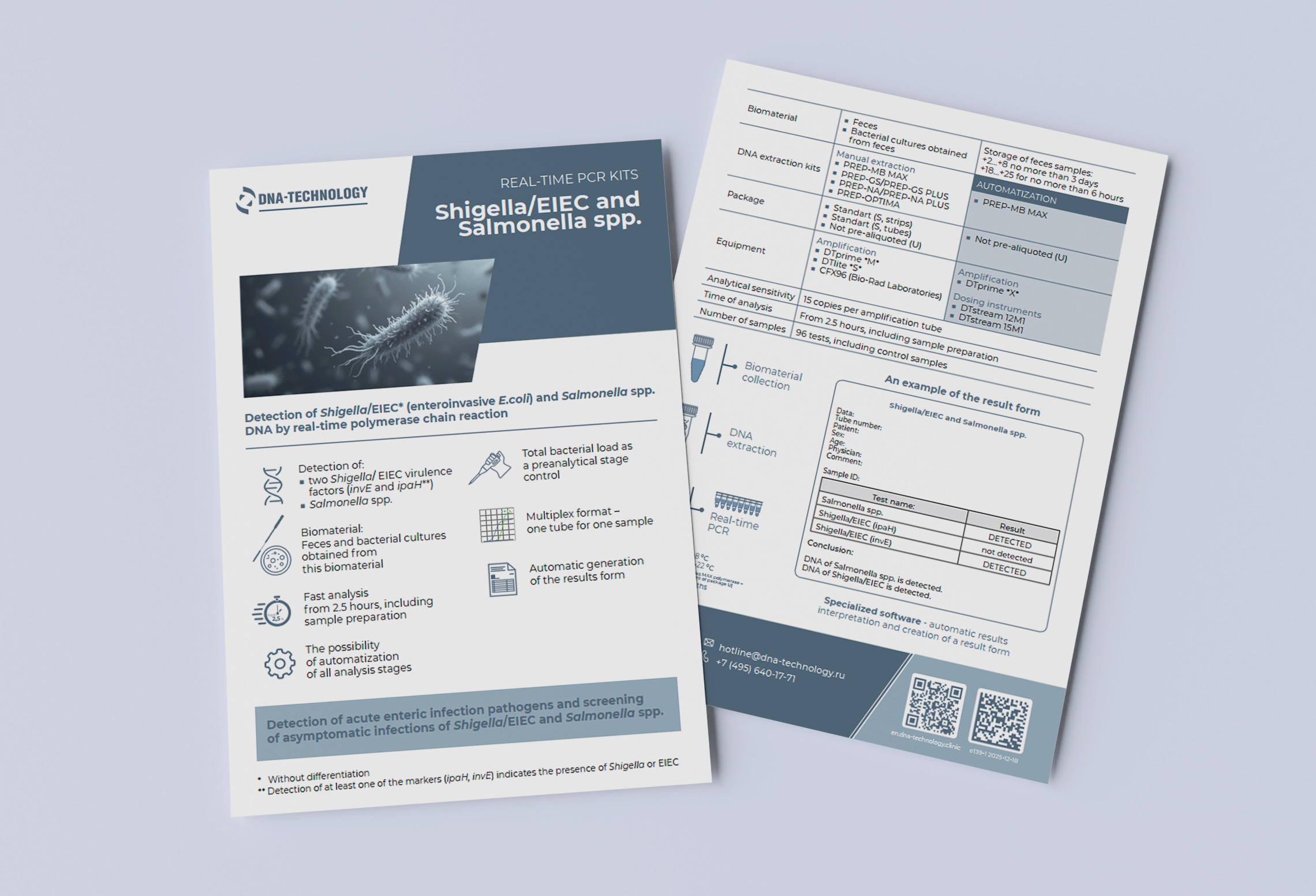 The Shigella/EIEC and Salmonella spp. REAL-TIME PCR Detection Kit is designed to detect DNA of Shigella and enteroinvasive E.coli (EIEC) (without differentiation) and Salmonella genus pathovar bacteria in human biological material (feces) and bacterial cultures obtained from this biomaterial, by real-time PCR.