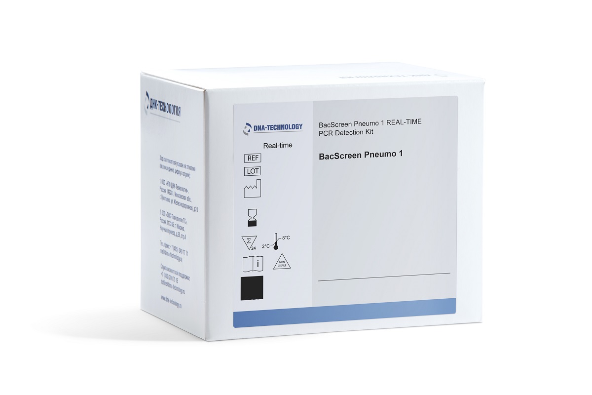 The BacScreen Pneumo 1 REAL-TIME PCR Detection Kit is designed to detect DNA of bacteria (Chlamydophila pneumoniae, Mycoplasma pneumoniae, Moraxella catarrhalis, Klebsiella pneumoniae, Streptococcus pneumoniae, Haemophilus influenzae, Staphylococcus aureus, Legionella pneumophila, Acinetobacter spp., Escherichia coli, Pseudomonas aeruginosa) causing respiratory nosocomial and community-acquired infections by real-time polymerase chain reaction.
