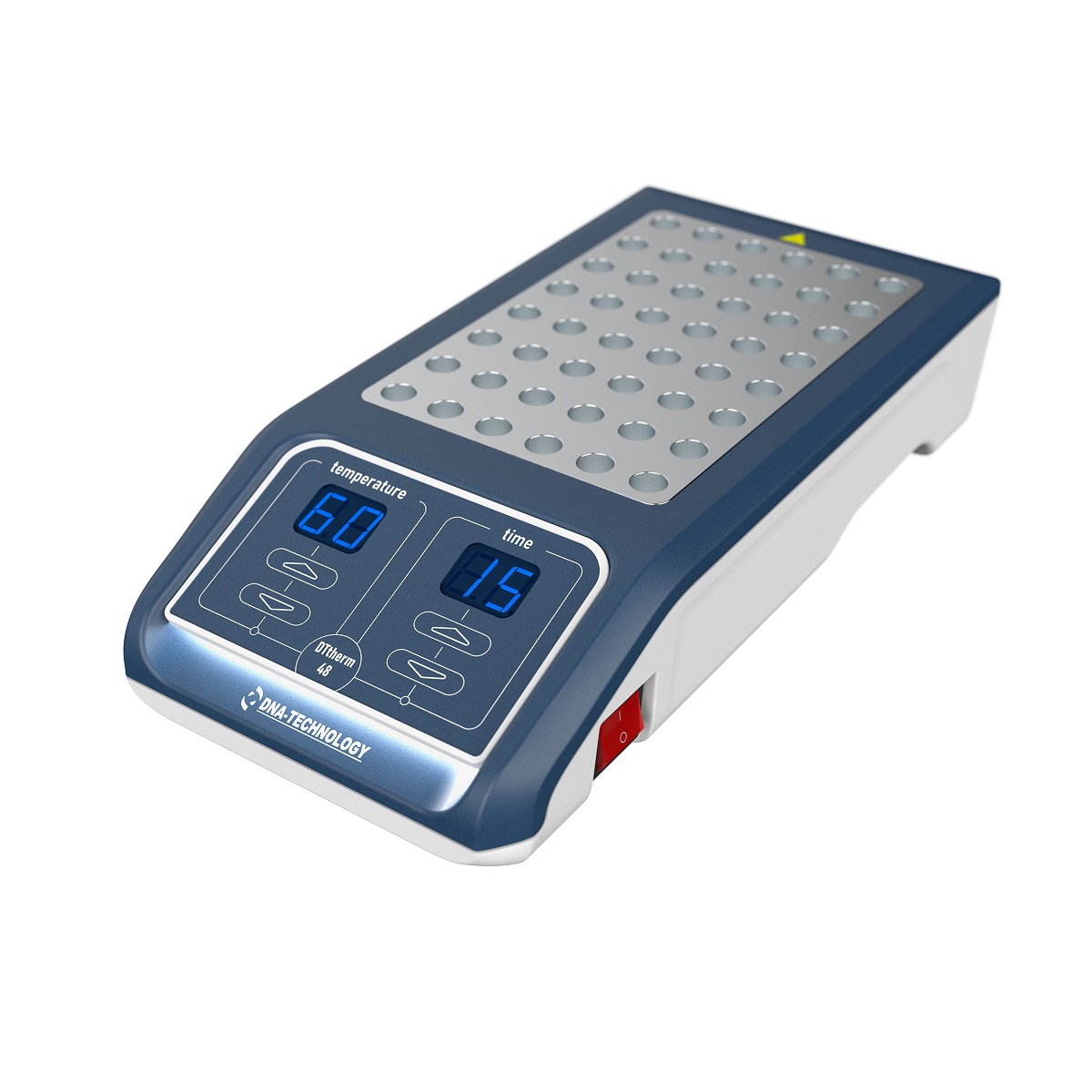 The thermostat is designed to hold 48 tubes. This capacity is especially convenient for PCR methods where the sample count is a multiple of 8. Compatible consumables include 1.5 ml conical Eppendorf tubes.