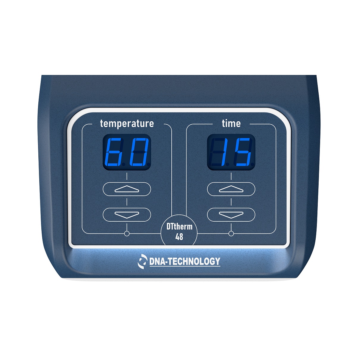The control panel is located on the front of the device and is divided into two sections, allowing independent temperature and time control. Bright blue indicators clearly display the current temperature and time from any angle and through the protective glass of the cabinet. Heating of the thermoblock begins only after the desired temperature has been selected.